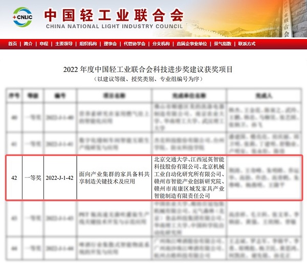 近日,中國輕工業聯合會在官網發布了經評審通過的“2022年度中國輕工業聯合會科學技術獎建議獲獎項目”名單。北京機械工業自動化研究所有限公司(簡稱北自所)參與完成的《面向產業集群的家具備料共享制造關鍵技術與應用》項目,榮獲2022年度中國輕工業聯合會科技進步一等獎。