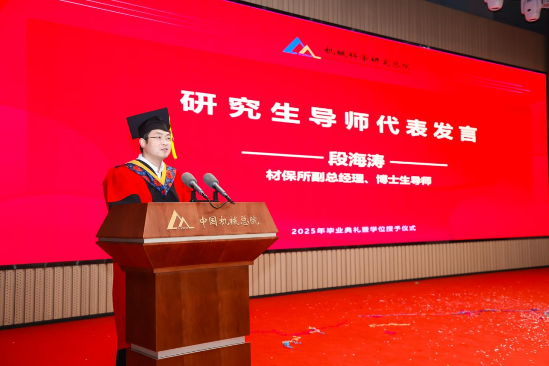 材保所副總經理、博士生導師段海濤作為導師代表發(fā)言,為全體畢業(yè)生送上囑托和期望。他希望同學們樹立“大志向”、堅守“大擔當”、秉持“大情懷”,用真才實學鐫刻屬于自己的璀璨印記。
